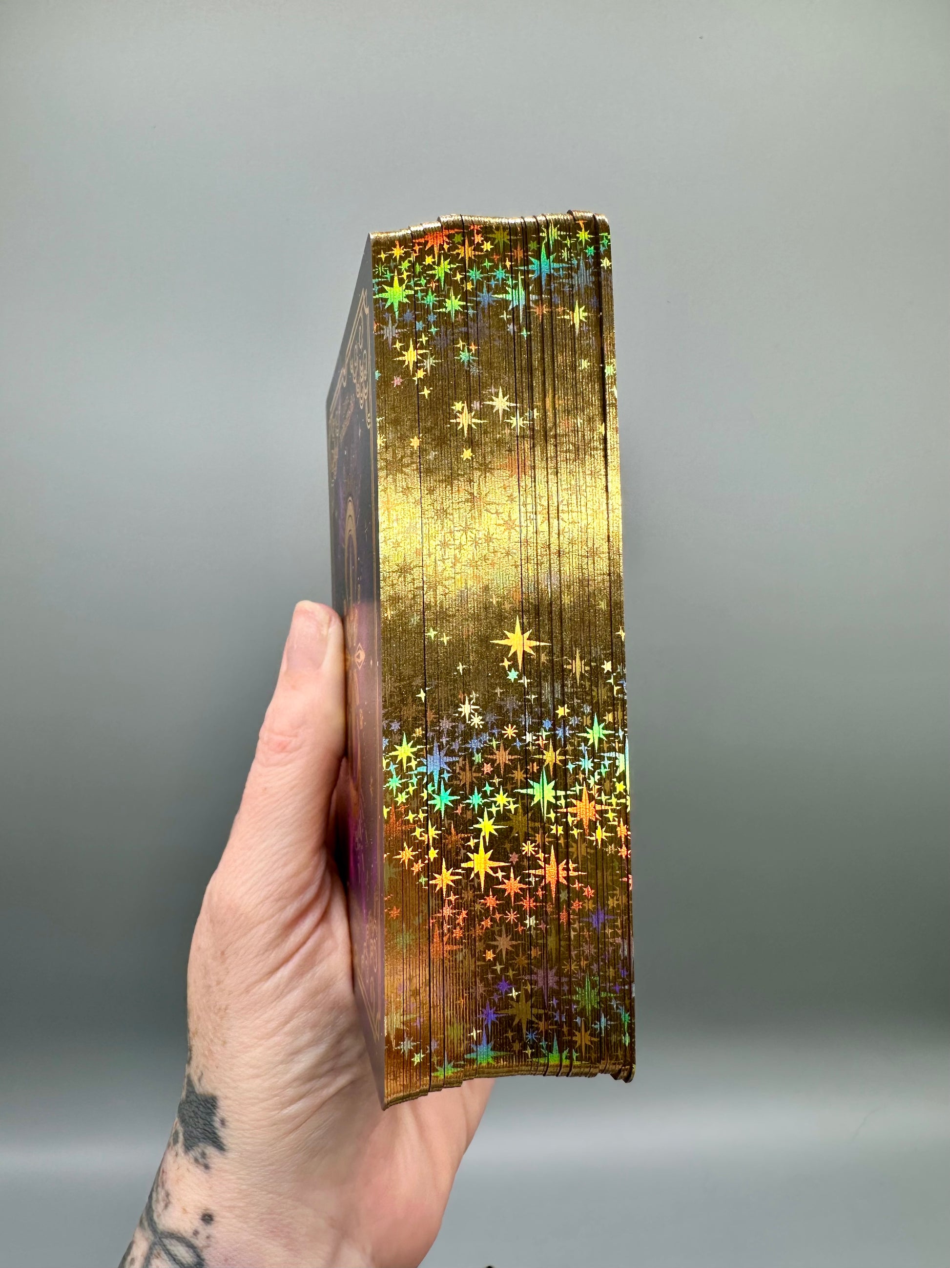 -78 cards, measuring 3.5" x 5" matte finish with gold holographic rainbow foil print on both sides and a starry gold holographic rainbow edge (creators note: a lot of the features of the cards are made by hand, not machine, and handmade items, by nature, may have imperfections)