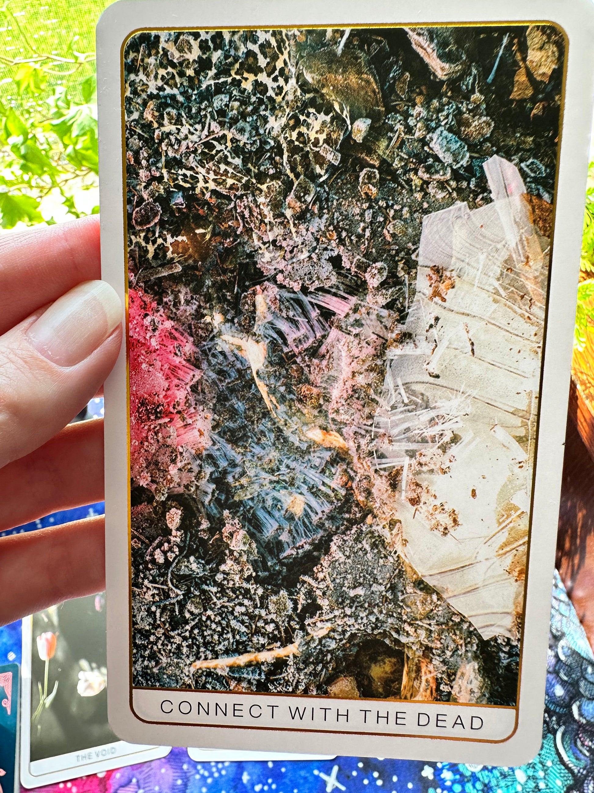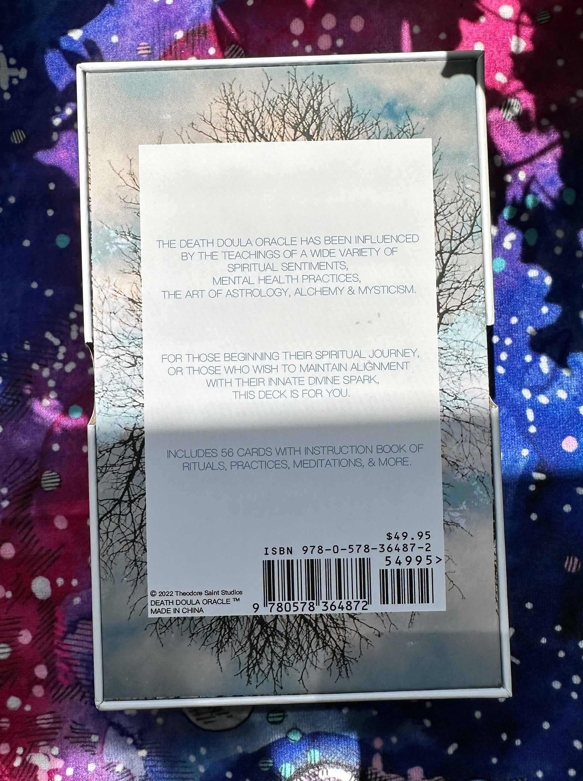 From the creator, "The Death Doula Oracle is designed to promote mystical & spiritual experiences at any stage of one's life, guiding the reader down a path of healing, self-discovery & rebirth. This deck becomes your personal doula and guide, gently aiding your spiritual unfoldment, revealing your truest self while giving you the tools to live and die with grace. For those beginning their spiritual journey, or those who wish to maintain alignment with their innate divine spark, this deck is for you."