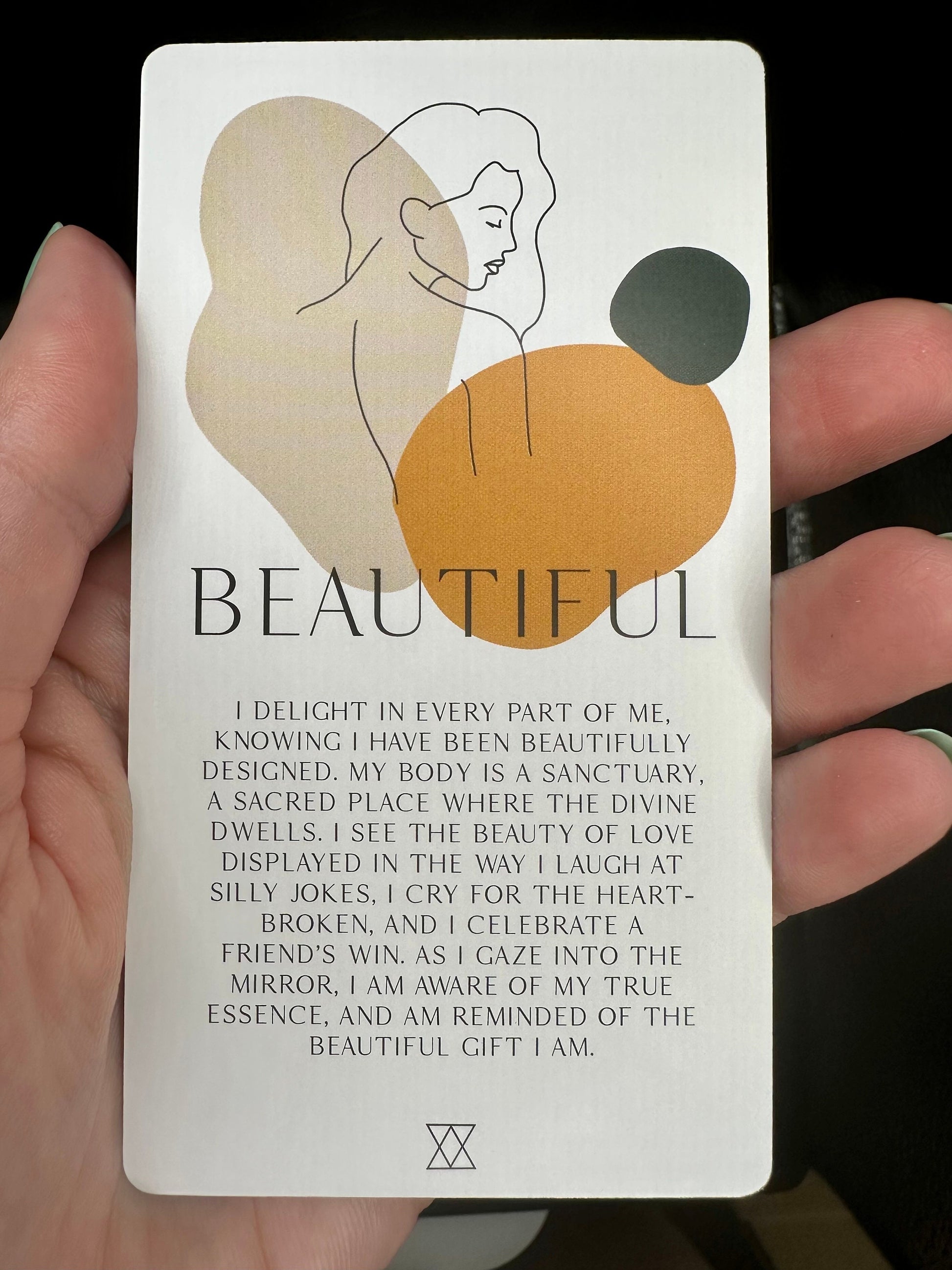 The deck is split into 3 categories: 1. Reflect: Journal prompts to deepen your awareness of self 2. Connect: Affirmations of your worth & value 3. Explore: Practices to strengthen your connection with your body.