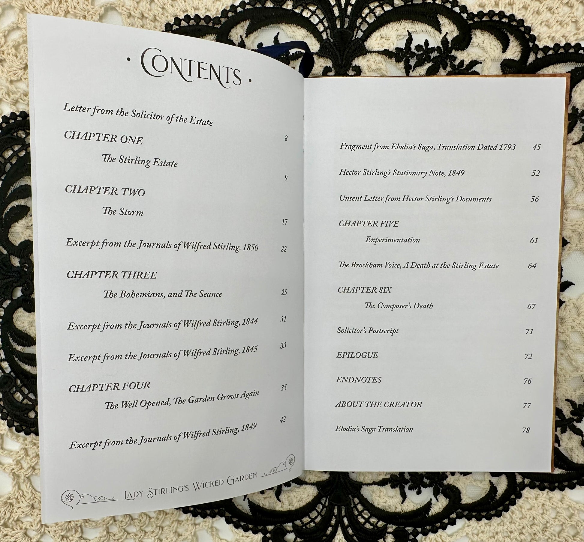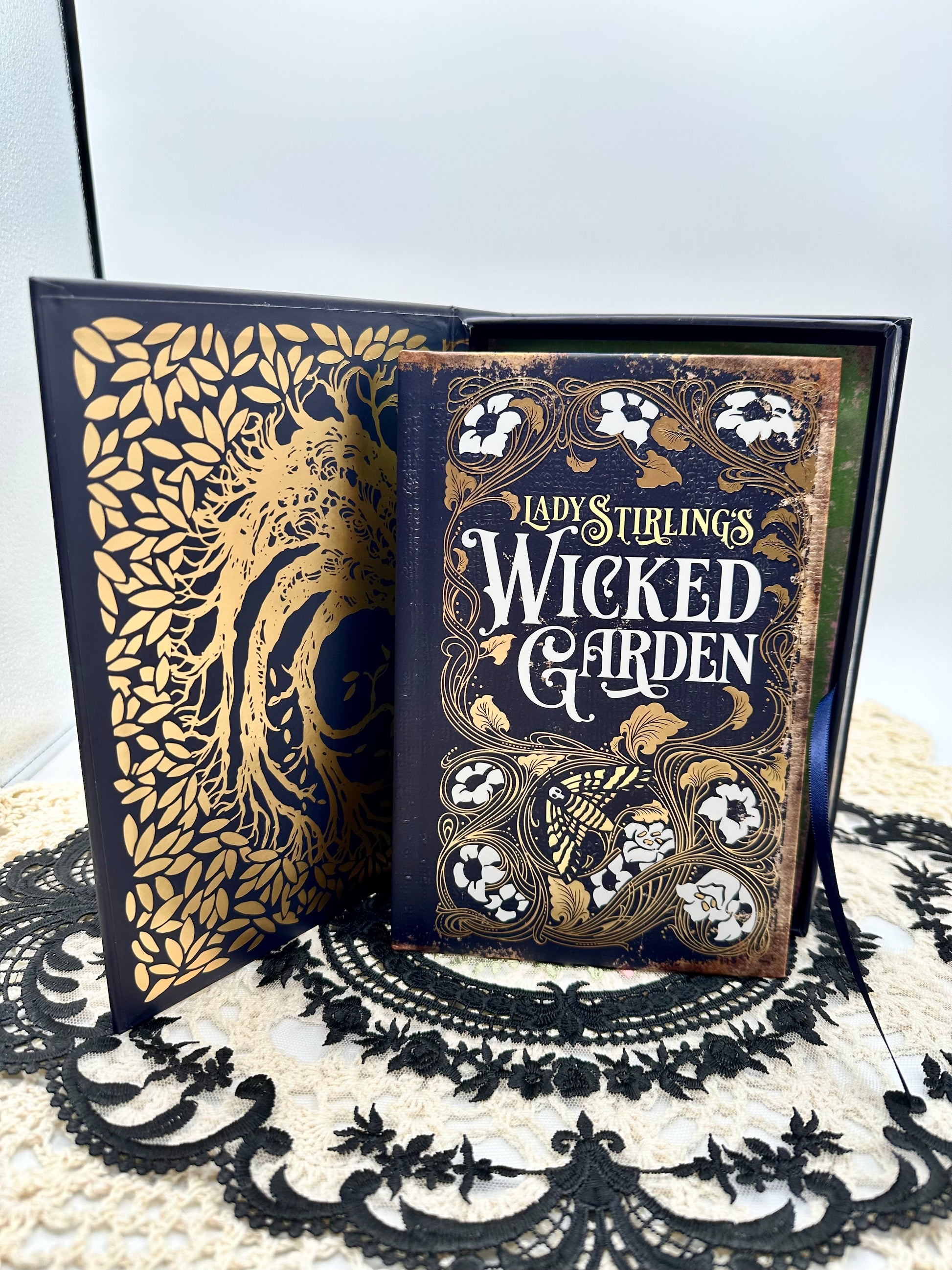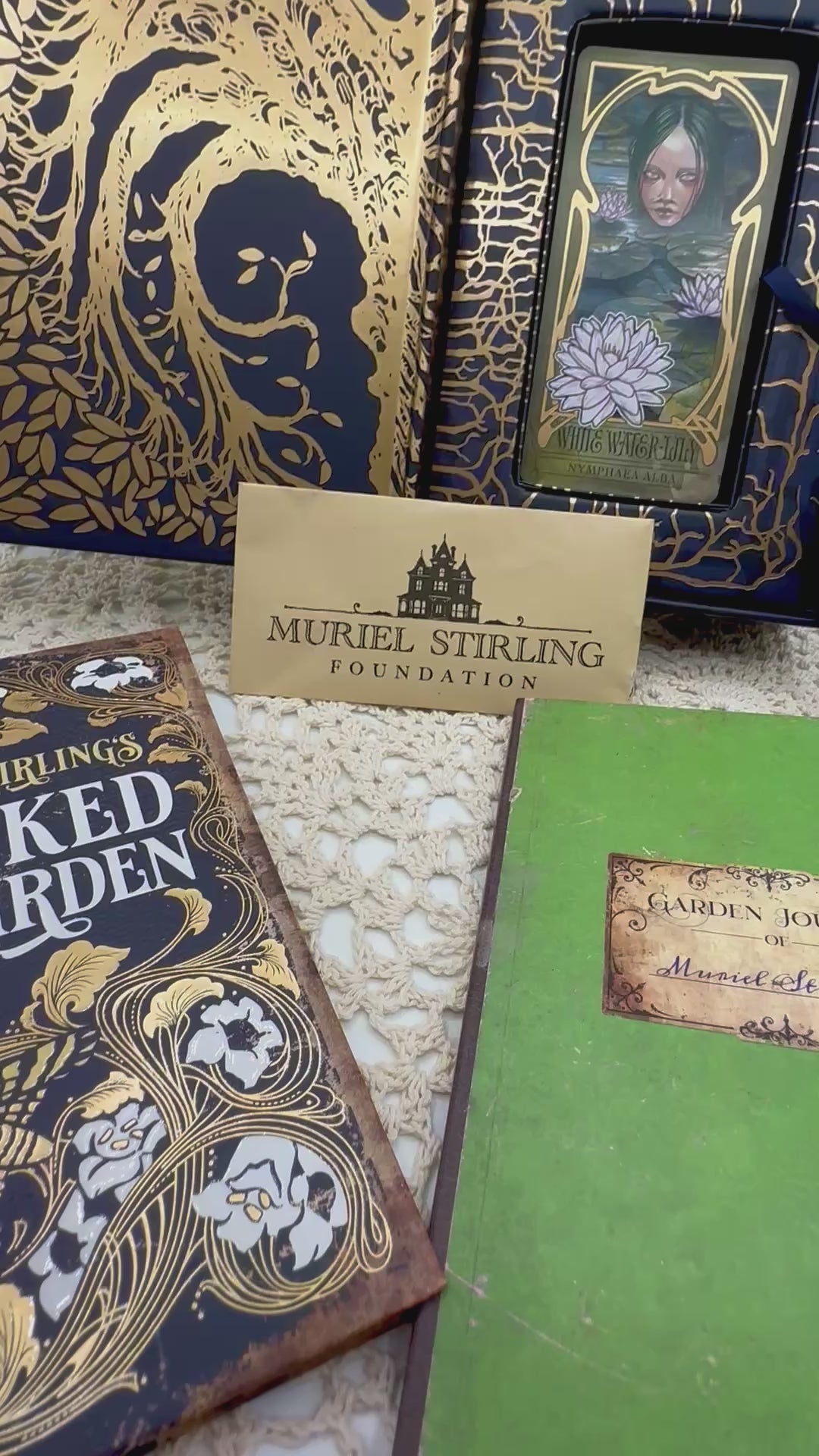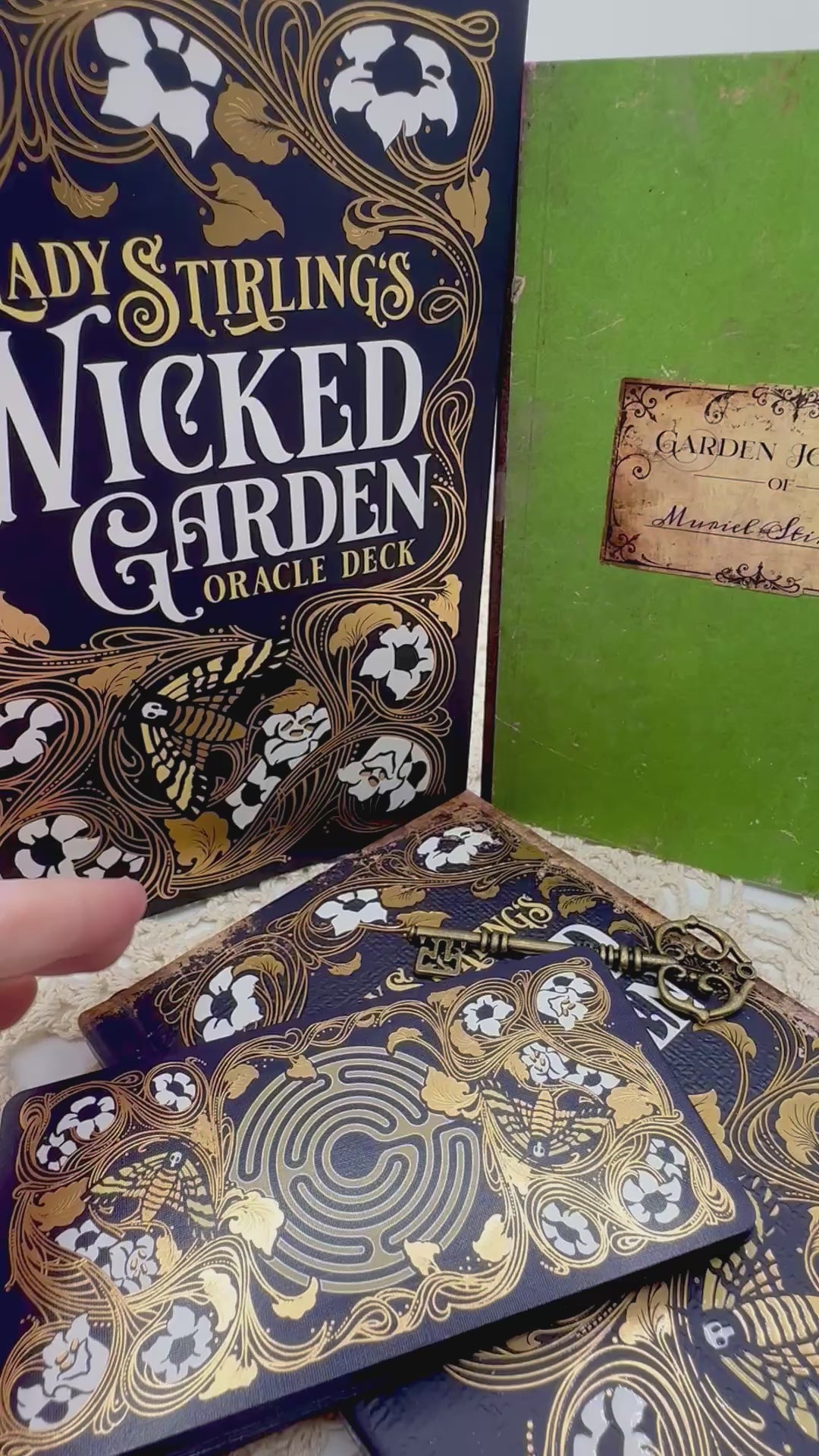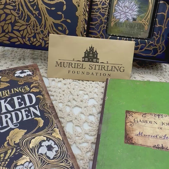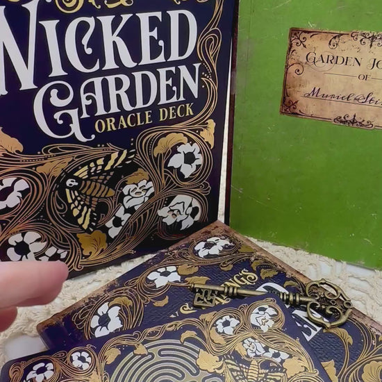 From the publisher, "Strange occurrences plagued the Stirling family estate until Muriel Stirling discovered a mystical, wicked garden where she meets the garden's inhabitants and its caretaker, Faunus. Read the poignant story of Muriel Stirling's Wicked Garden in the 80-page, full-color illuminated hardcover novelette. Meet the magical creatures living in the garden, featured in the 32-card gold foil-accented oracle deck with indigo edges. The 80-page full-color journal guidebook invites you into meaningful conversations with each garden spirit—from the deadly nightshade Belladonna to the fragrant Angel’s Trumpet—offering gentle yet powerful reflections on nature, emotion, and the hidden patterns within our lives. Deluxe, collector-worthy set includes your own copy of the key to the garden."