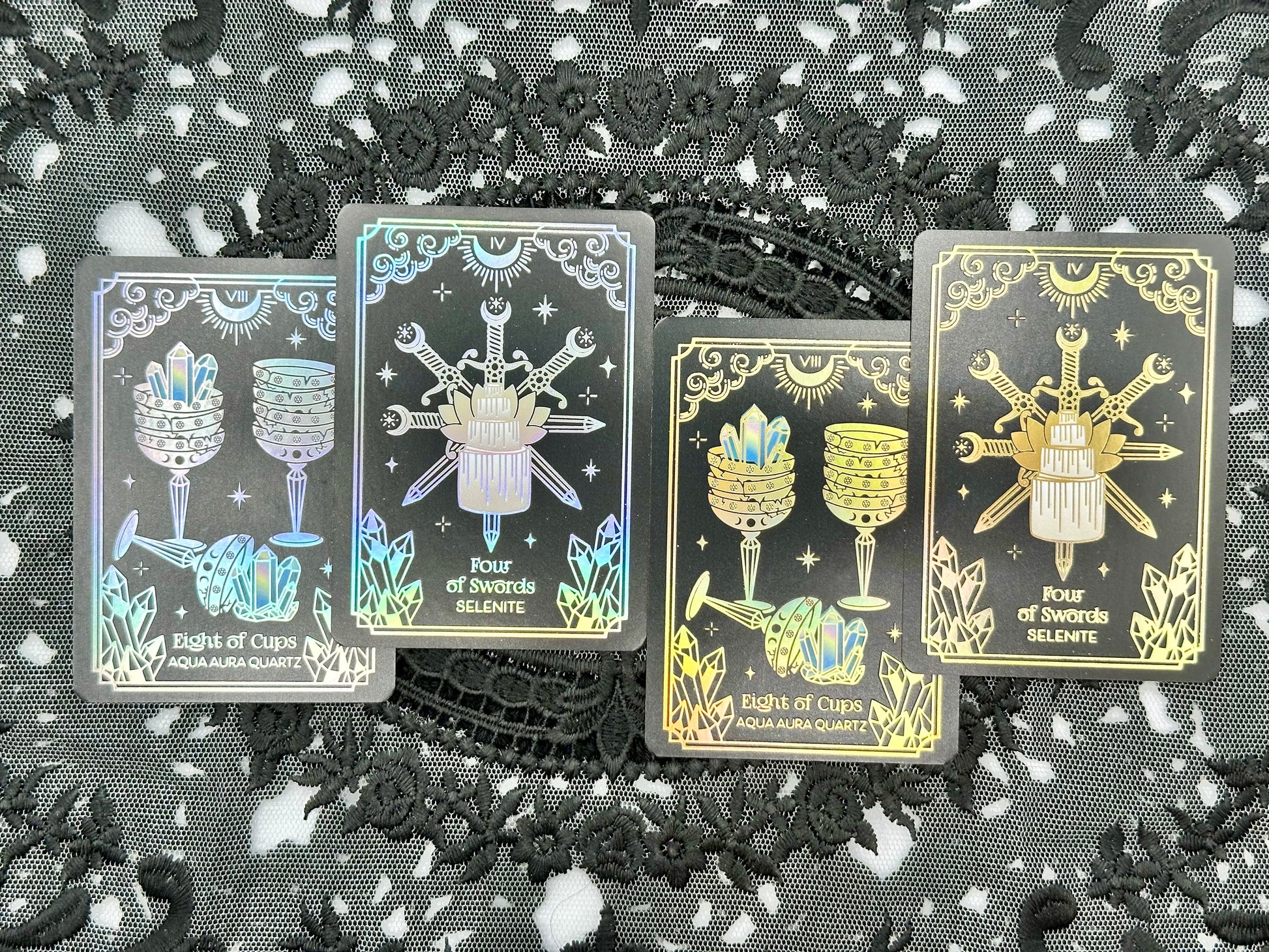 78 cards, measuring 2.5" x 3.5" matte finish with gold or silver holographic rainbow foil print on both sides and a starry gold or silver holographic rainbow edge (please note: a lot of the features of the cards are made by hand, not machine, and handmade items, by nature, may have imperfections)