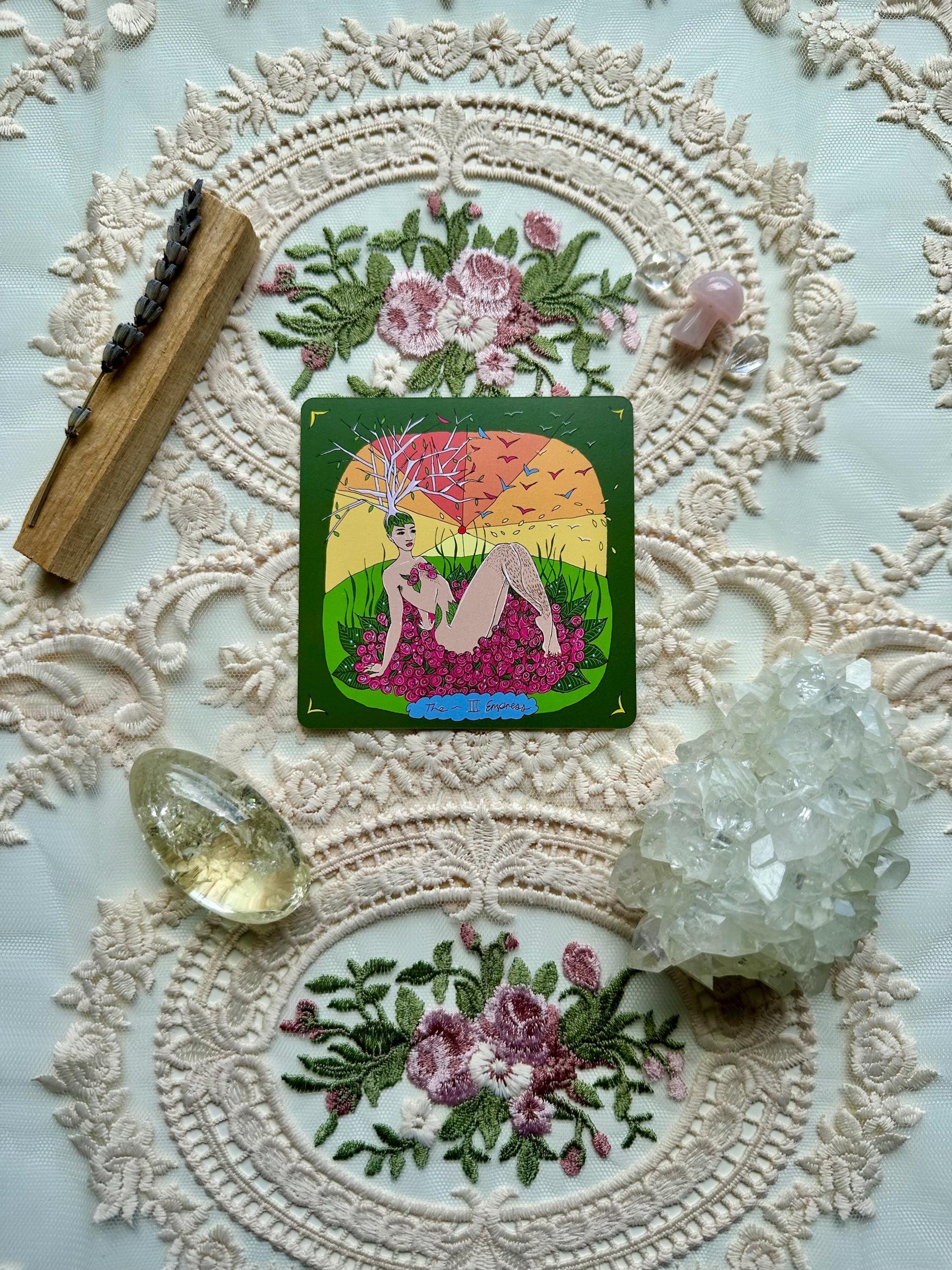 This is a vibrant deck. Overall it has a very uplifting, nurturing vibe. I enjoy using it whenever I want to tap into the many facets of the divine feminine. This is a square shaped deck, much like the Dark Days Tarot, allowing you to intuit the card's meaning not only by its symbology but also by its orientation.