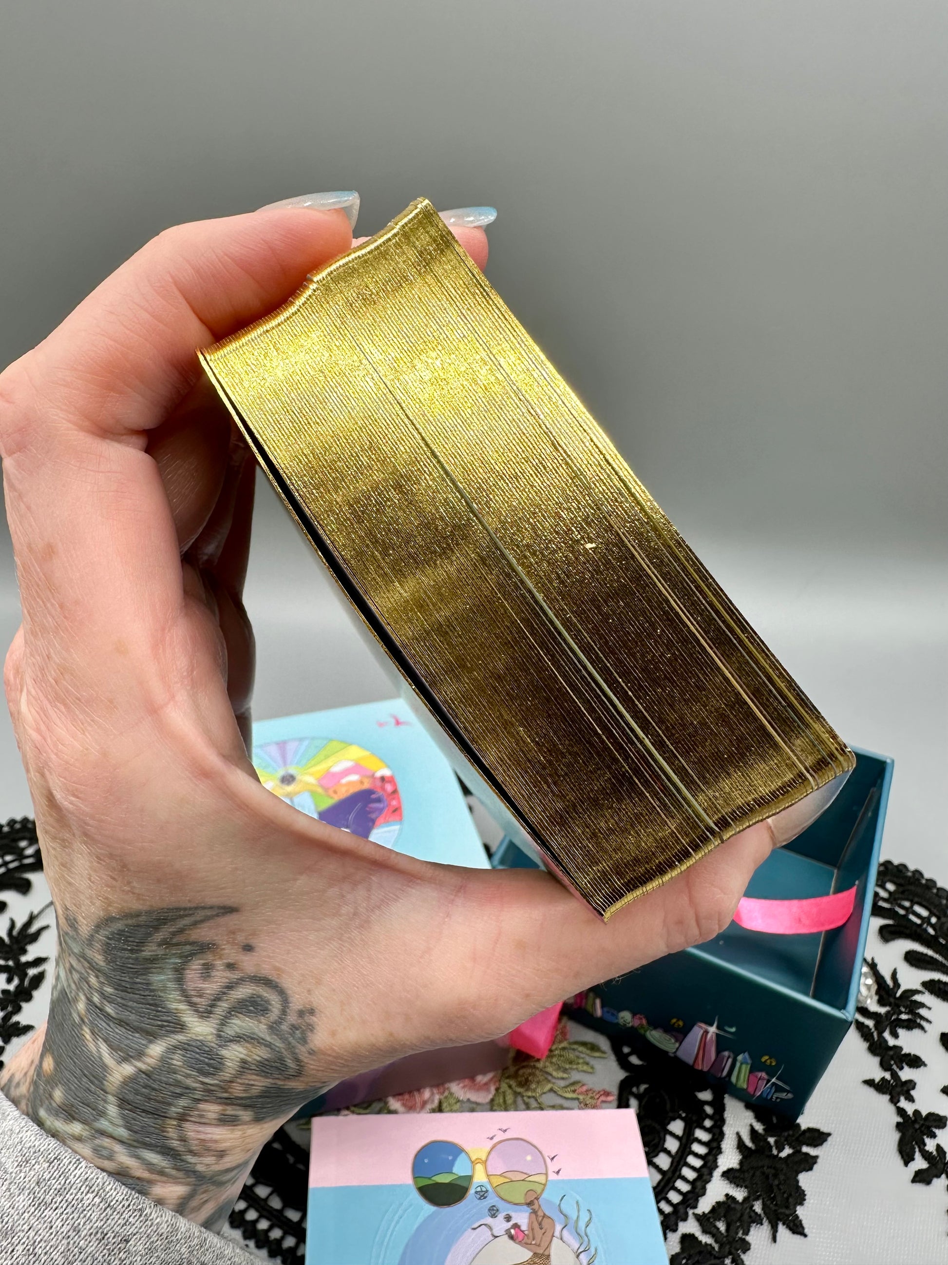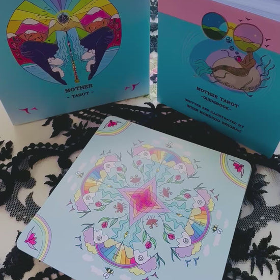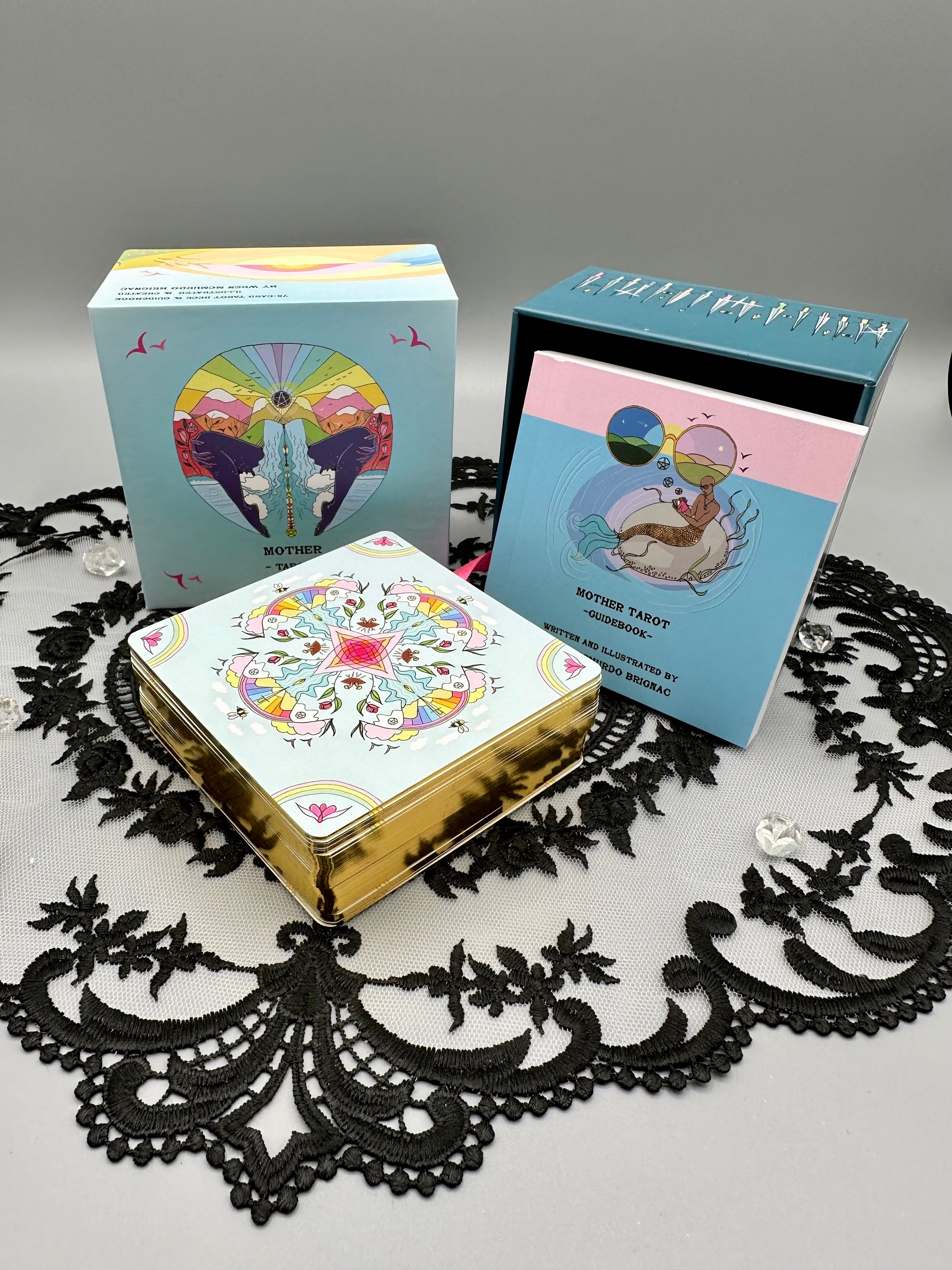 This beautiful and vibrantly colorful deck is the third edition of the Mother Tarot, featuring sturdier card stock and your choice of gold gilded edges or mermaid turquoise gilded edges.