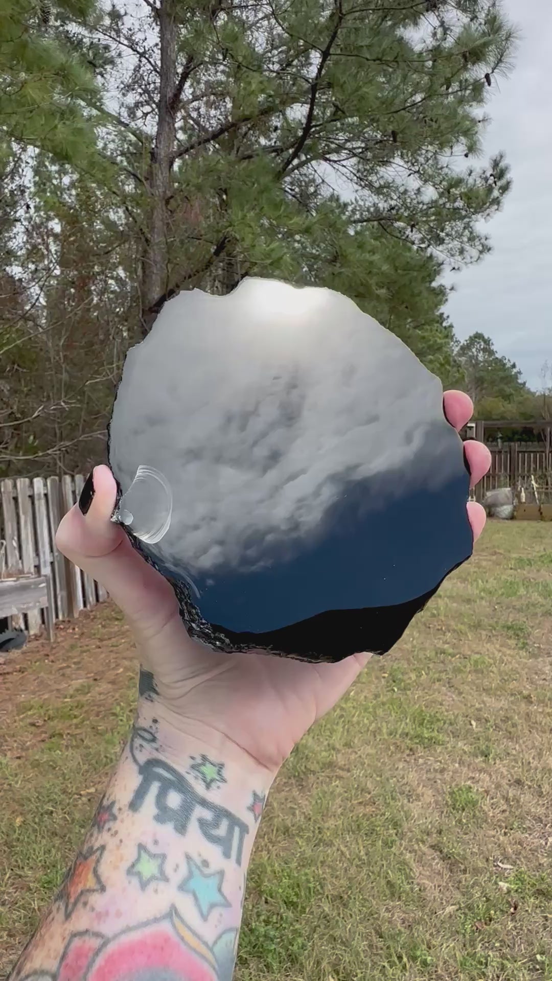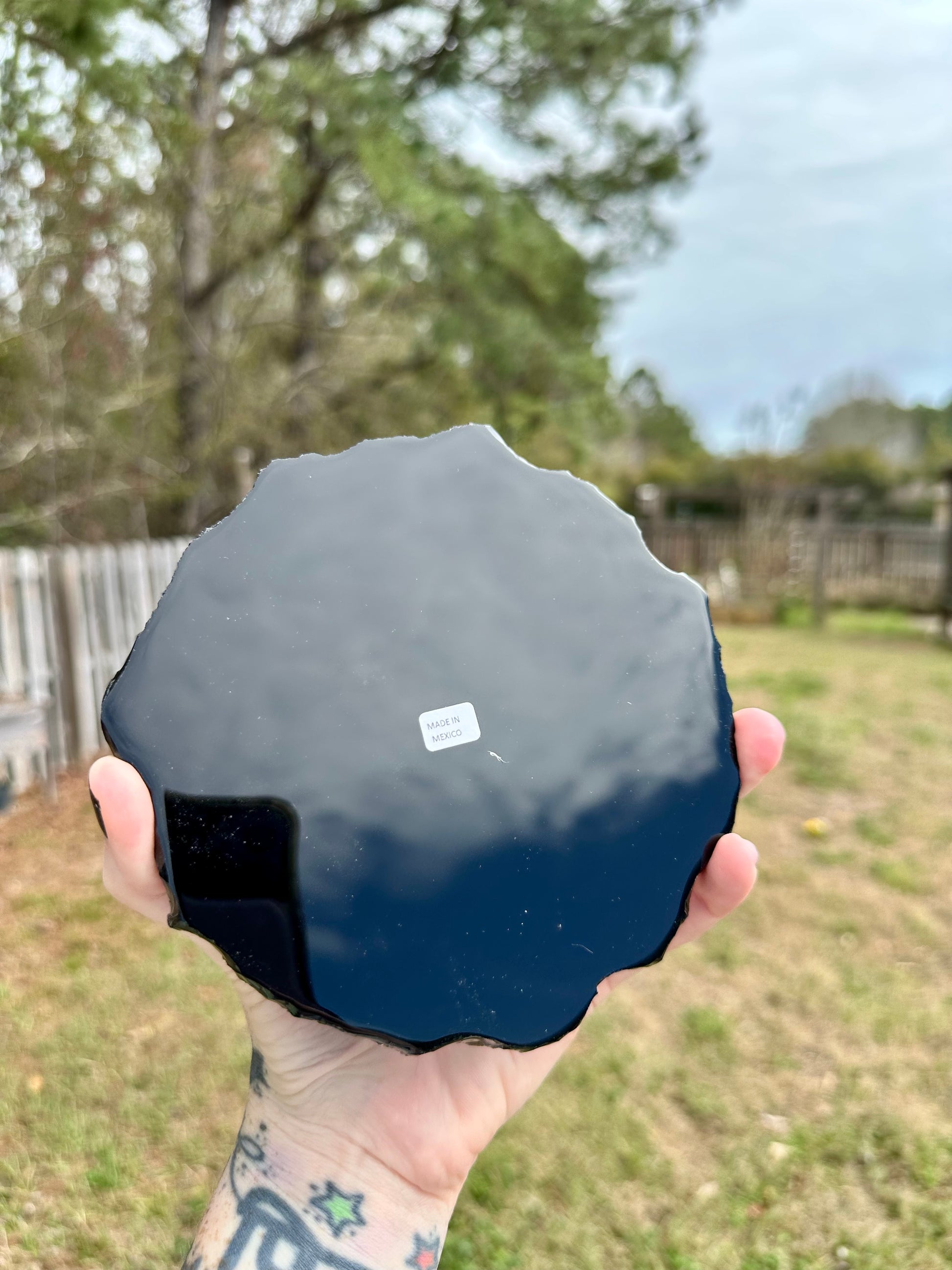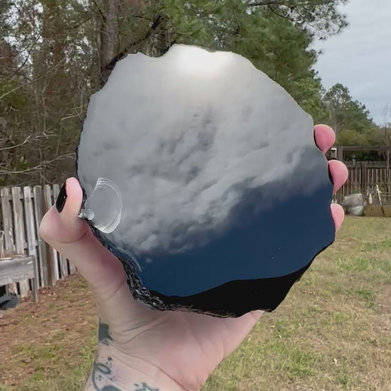 Gorgeous, polished Obsidian slabs with raw edges. These are absolutely beautiful!! Each one has been polished smooth with the edges left raw. Makes for a gorgeous effect. Perfect for display (I'd suggest a plate hanger), for use in magic and divination, including scrying, or as an altar space or even for home decor. These are so brilliant and shiny they even could double as a mirror! From Mexico.