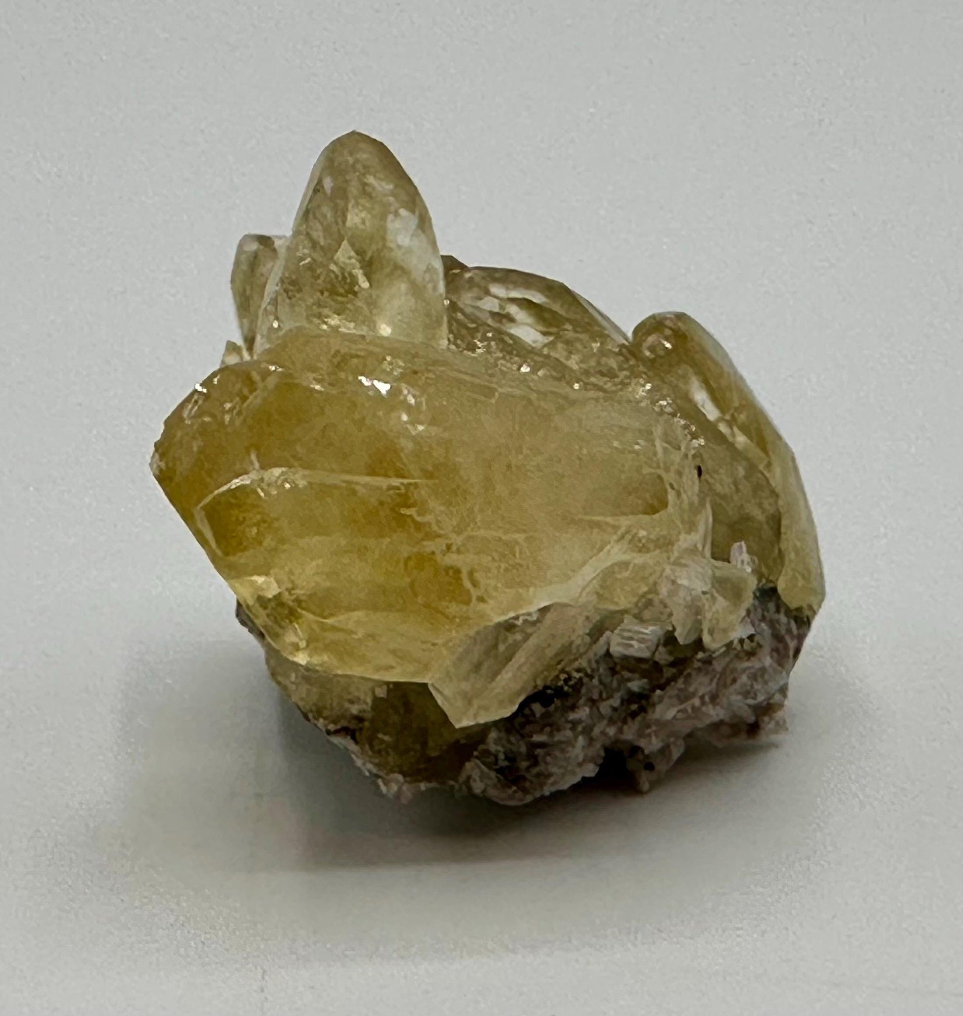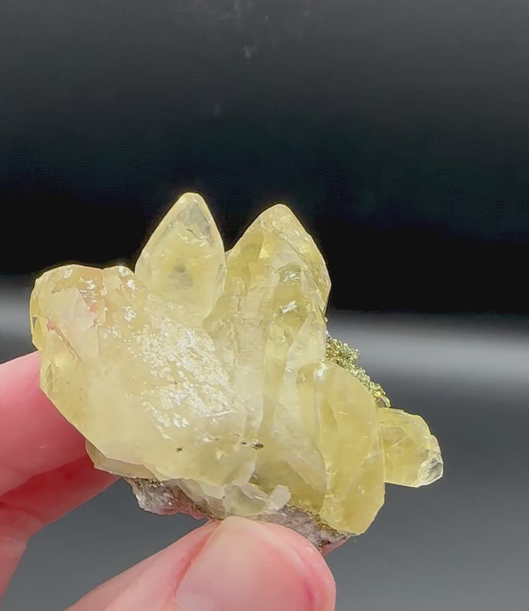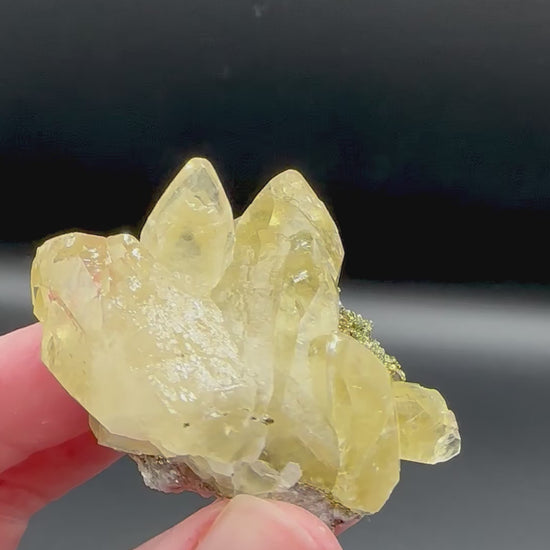 This listing is for one Calcite crystal cluster with excellent clarity and good terminations. The bottom matrix is covered with Chalcopyrite. A small but beautiful piece from this famed region. This specimen makes a great entry point for anyone looking to add a Sweetwater Calcite to their collection.