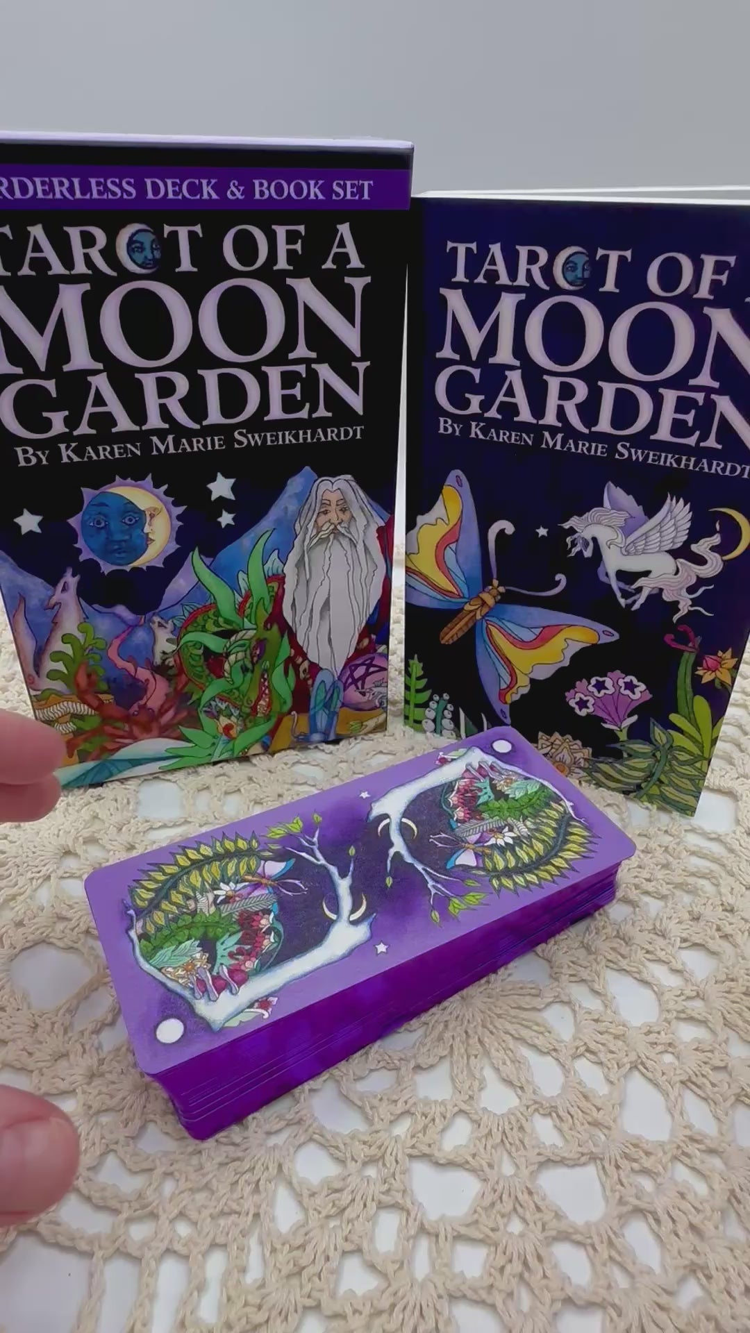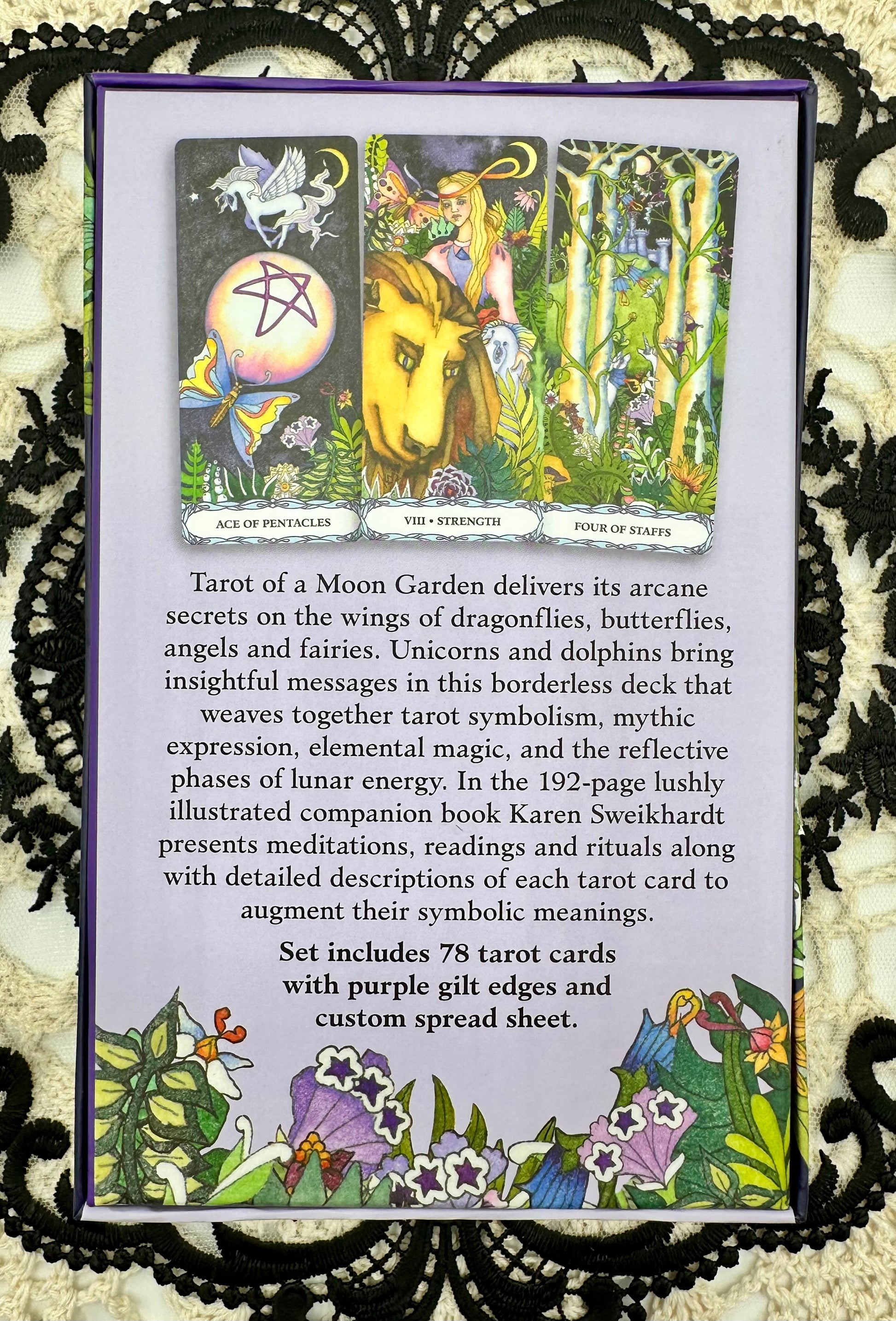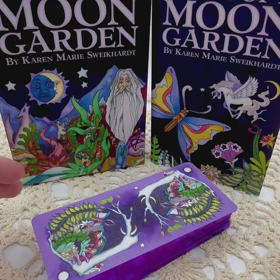 From the publisher, "Tarot of a Moon Garden delivers its arcane secrets on the wings of dragonflies, butterflies, angels and fairies. Unicorns and dolphins bring insightful messages in this borderless deck that weaves together tarot symbolism, mythic expression, elemental magic, and the reflective phases of lunar energy. In the 192-page full-color illustrated companion book, Karen Marie Sweikhardt presents meditations, readings, and rituals along with descriptions of each tarot card to augment their symbolic meanings."
