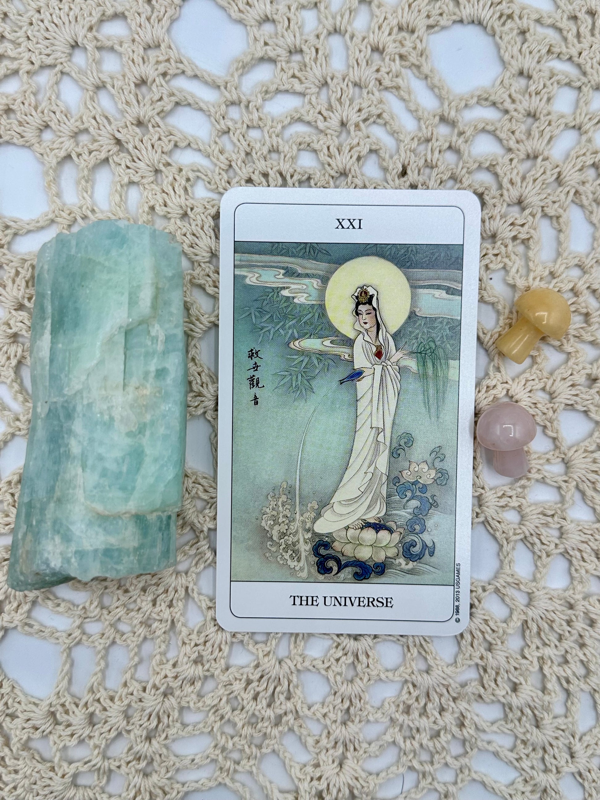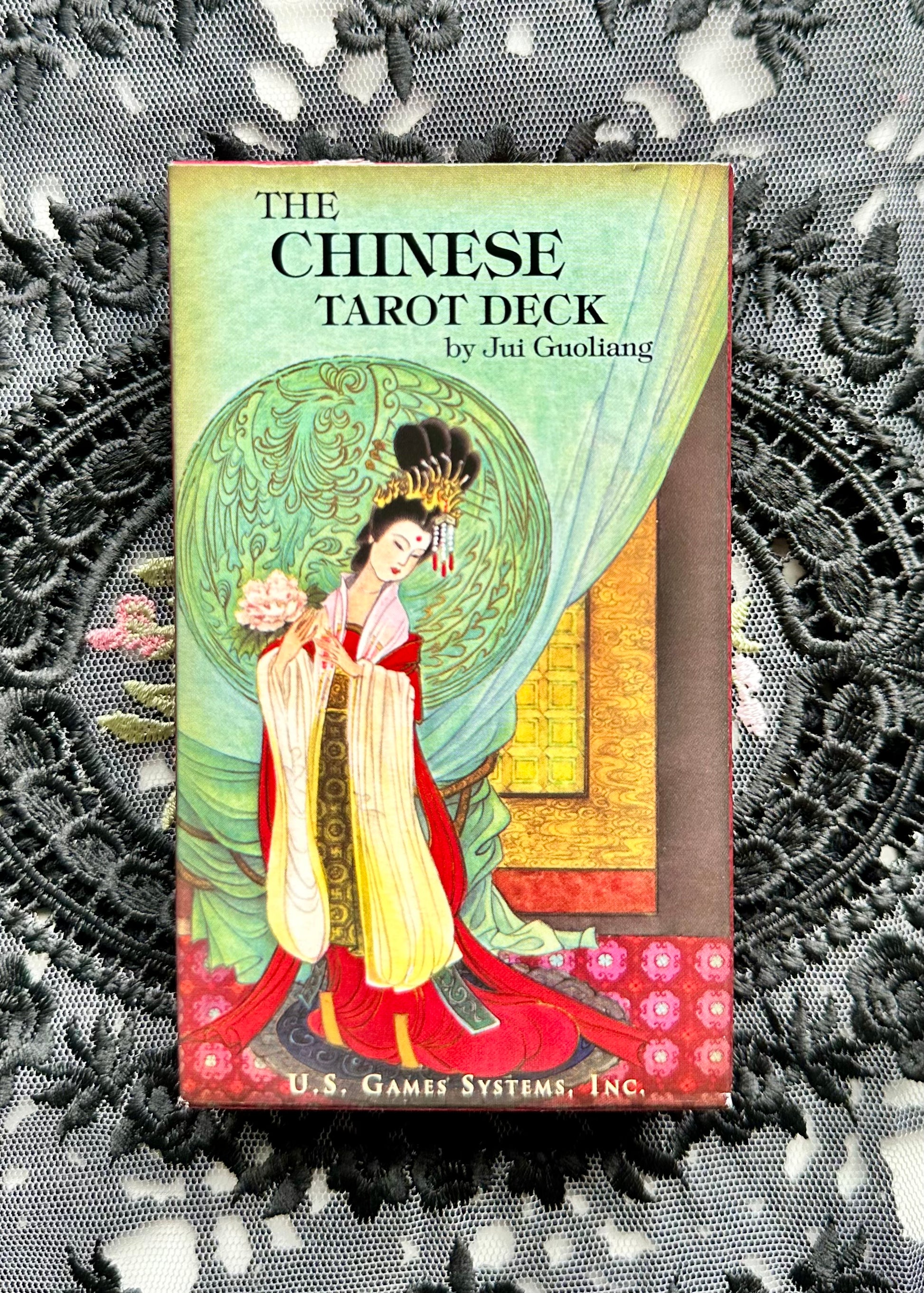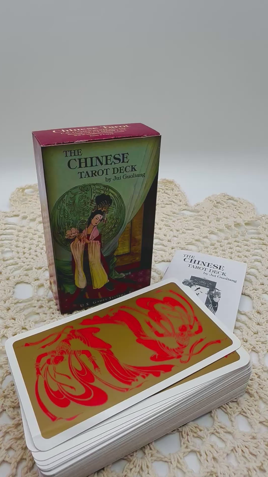 From the publisher, "Rendered in the rich style of traditional Chinese artwork, the vibrant colors and clear messages of The Chinese Tarot Deck offer an aesthetic and accessible tarot experience. Jui Guoliang has created elegant ink and watercolor designs that skillfully blend archetypal symbols of Ancient Chinese literature, legend, philosophy, and culture. The Major Arcana draws upon the benevolent wisdom and insight of inspirational figures such as Confucius, Kuan Yin, and Chang Tao Ling, the Heavenly Master. The fully pictorial Minor Arcana are equally endowed with the lessons of Chinese history. The booklet by Stuart R Kaplan offers a description of each card's symbolism, with both upright and reversed meanings."