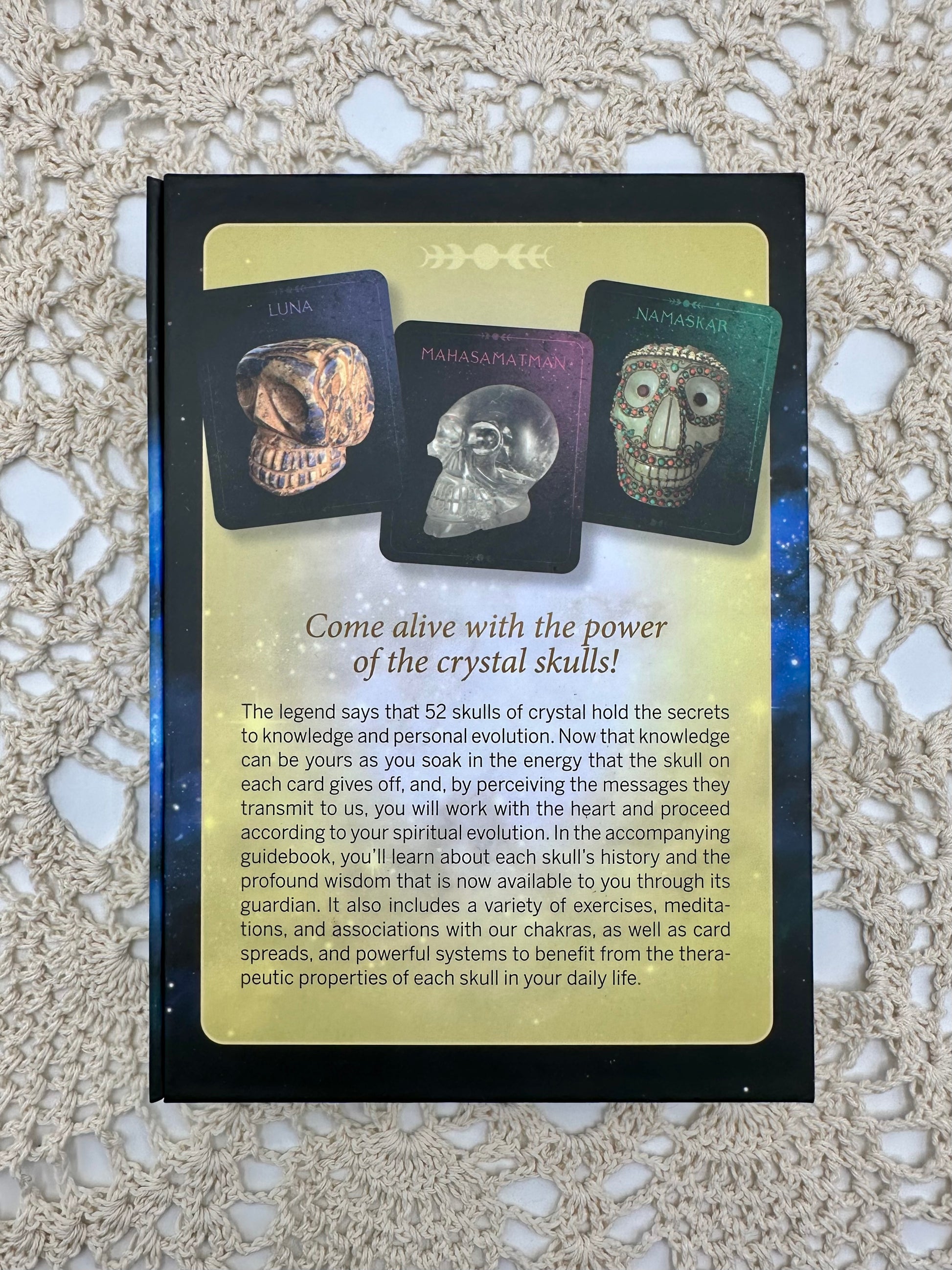 The Oracle of the Crystal Skulls is a 52 Card Deck that contains pictures of healing crystal skulls from around the world. The guidebook goes in depth into: the legend of the crystals skulls, associations with chakras, how to use the oracle deck (including multiple card spreads) as well as in depth information on each skull featured including the skull's healing message. These re great cards for crystal work, crystal griding and to meditate with.