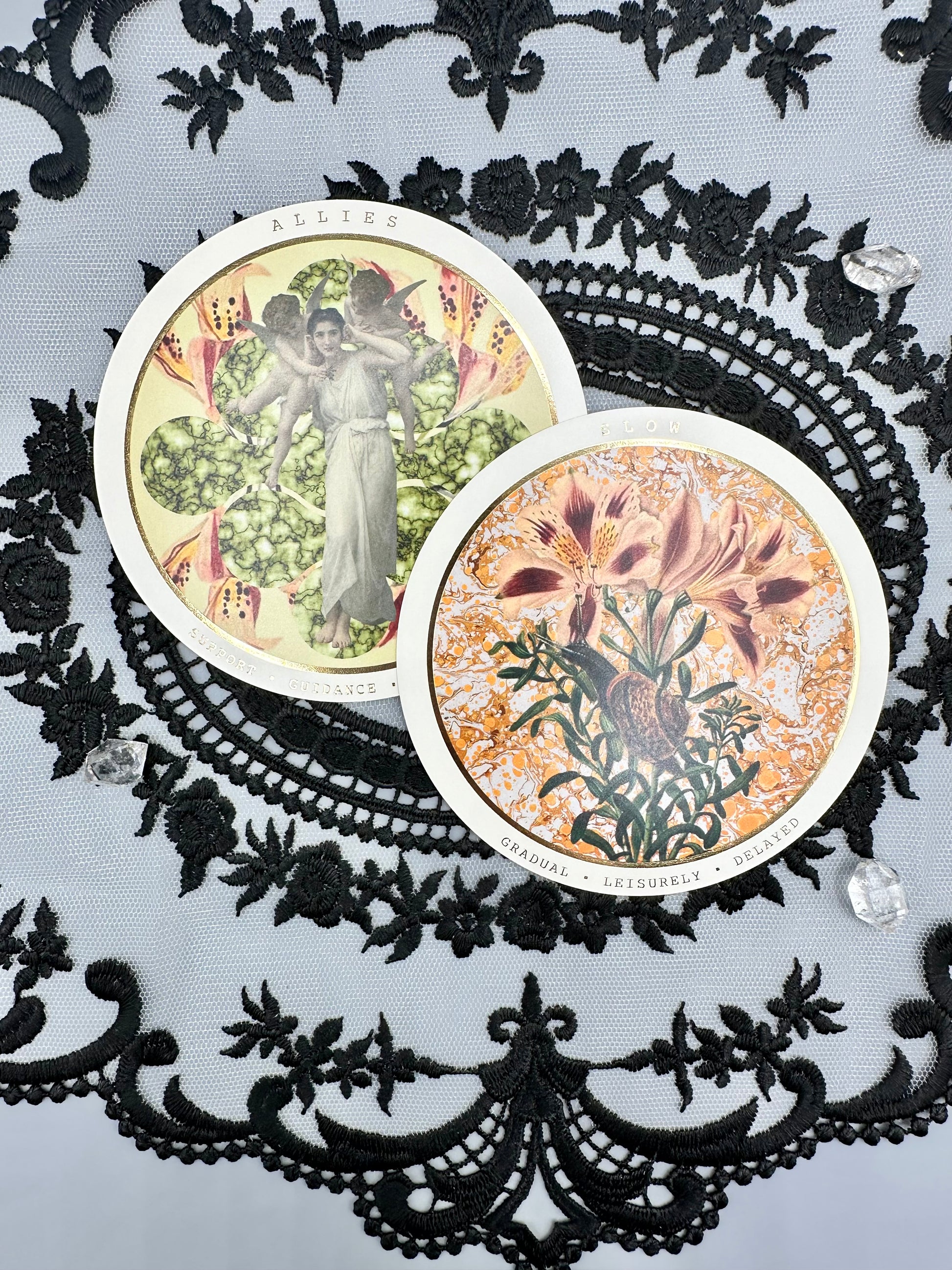 44 full color, round cards, measuring 4" in diameter with gold foil accents