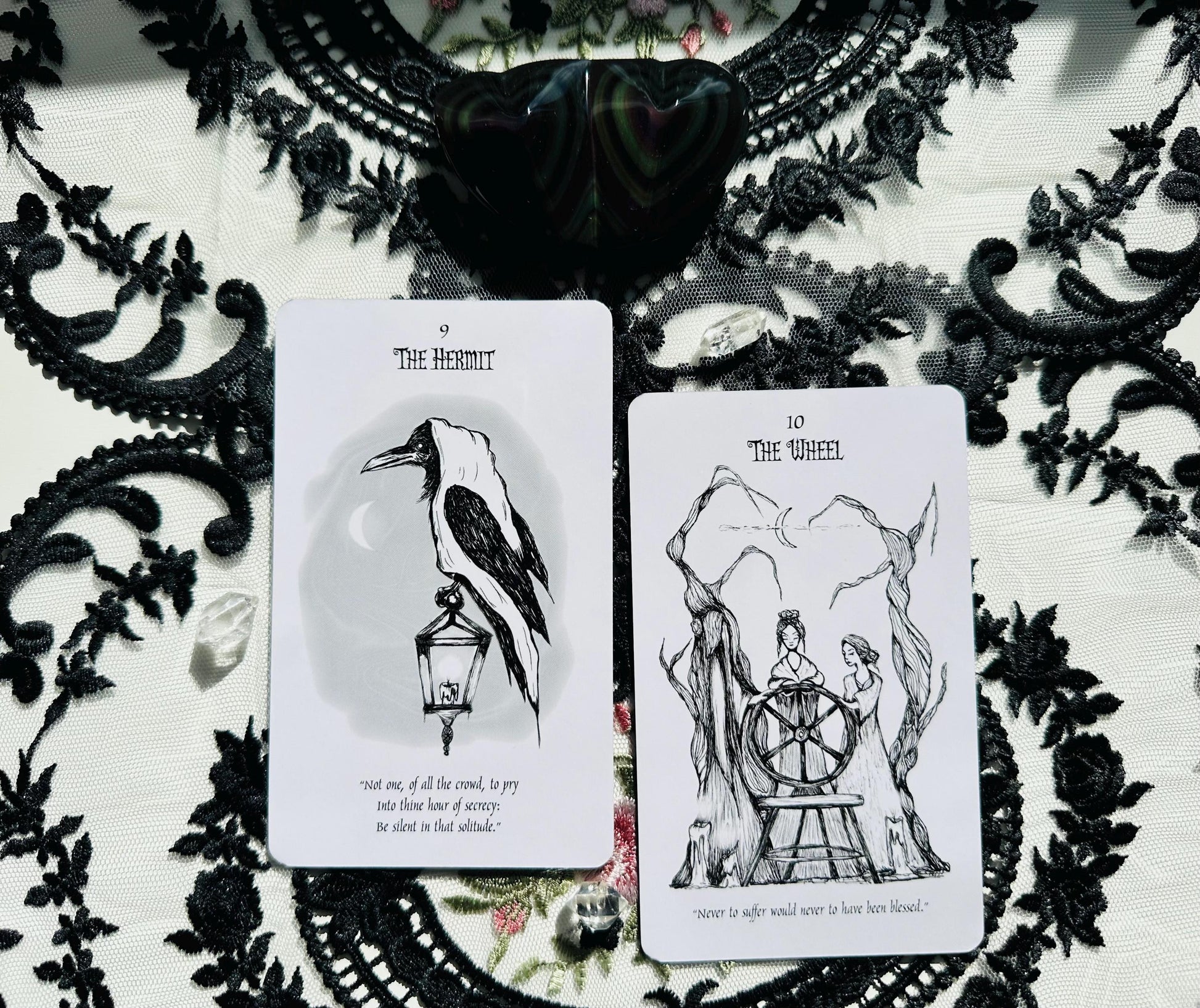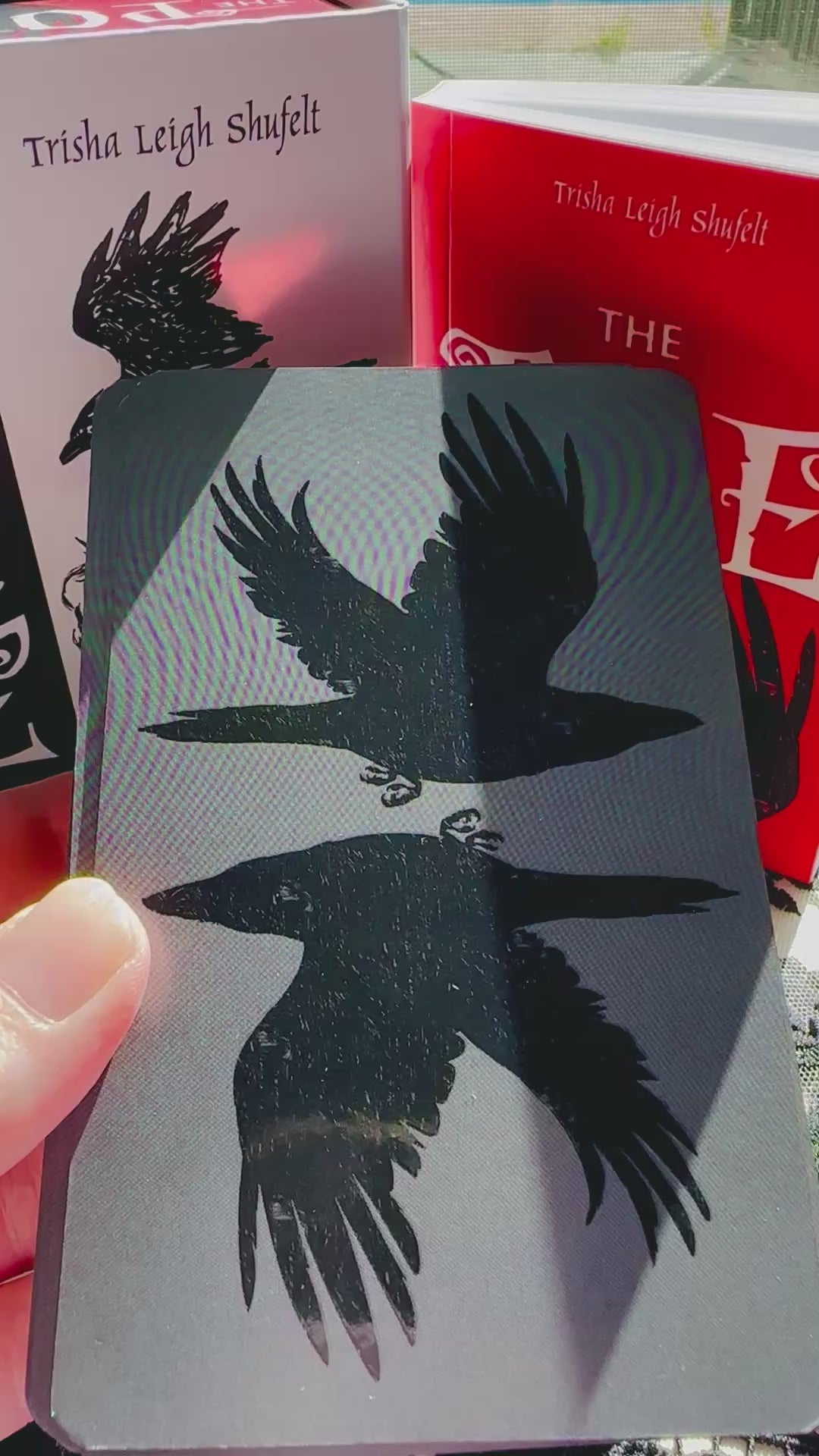 The black-and-white illustrations are by mixed-media artist/author Trisha Leigh Shufelt and are paired on each card with quotes from the literary works and thoughts of Edgar Allan Poe. Images are directly inspired by such classics as The Raven, Annabel Lee, The Masque of the Red Death, and many more while utilizing traditional Tarot archetypes.