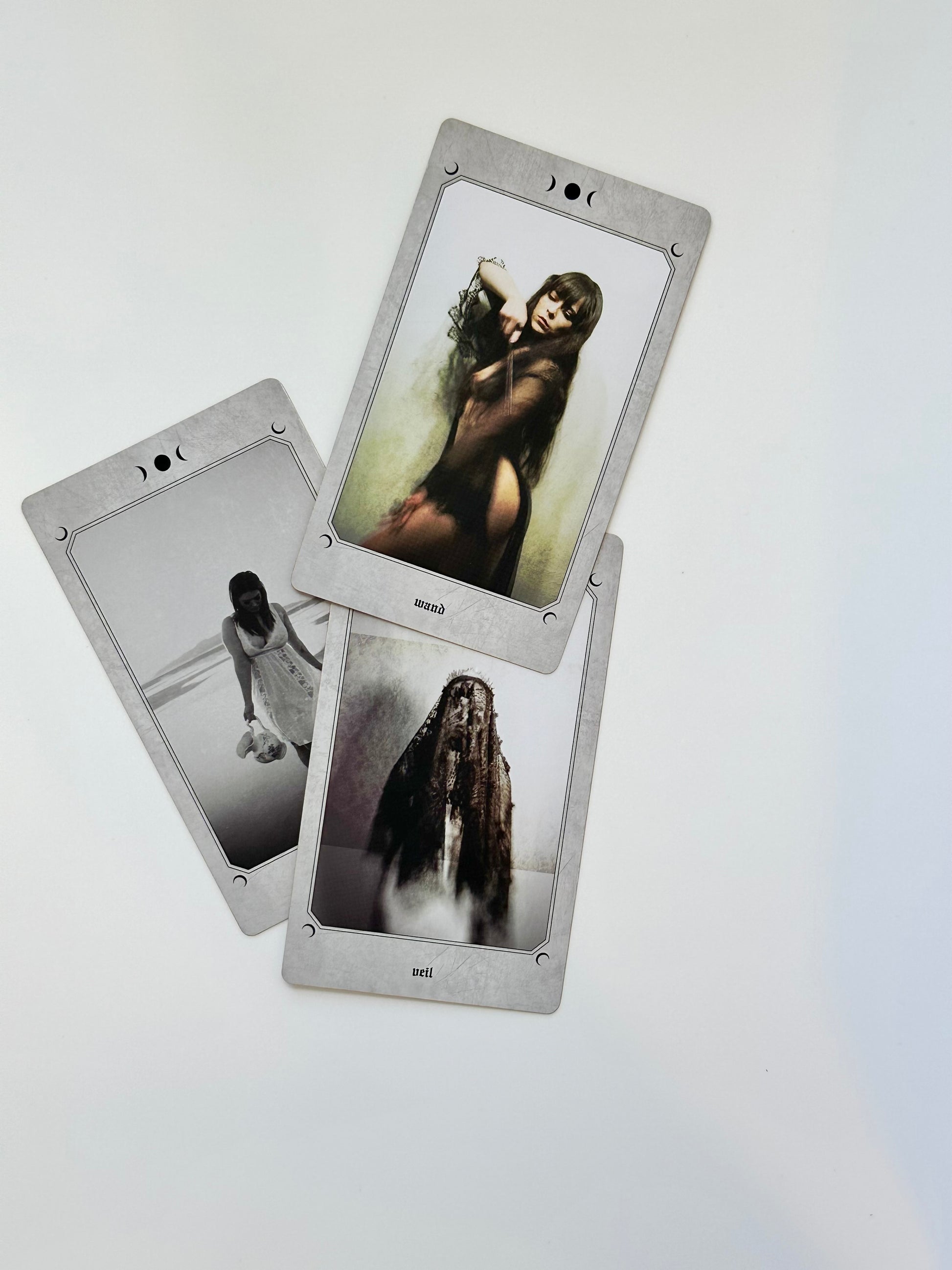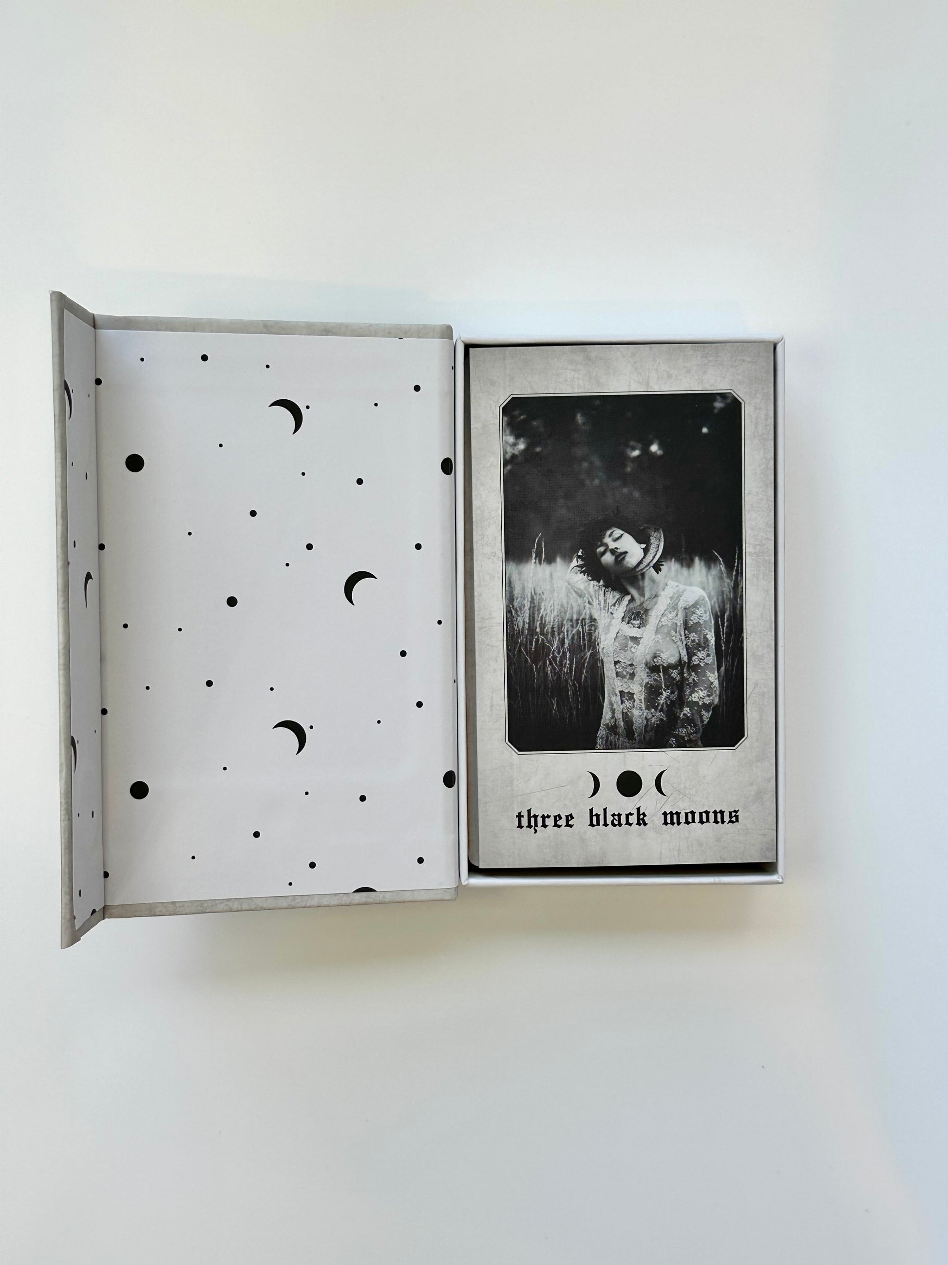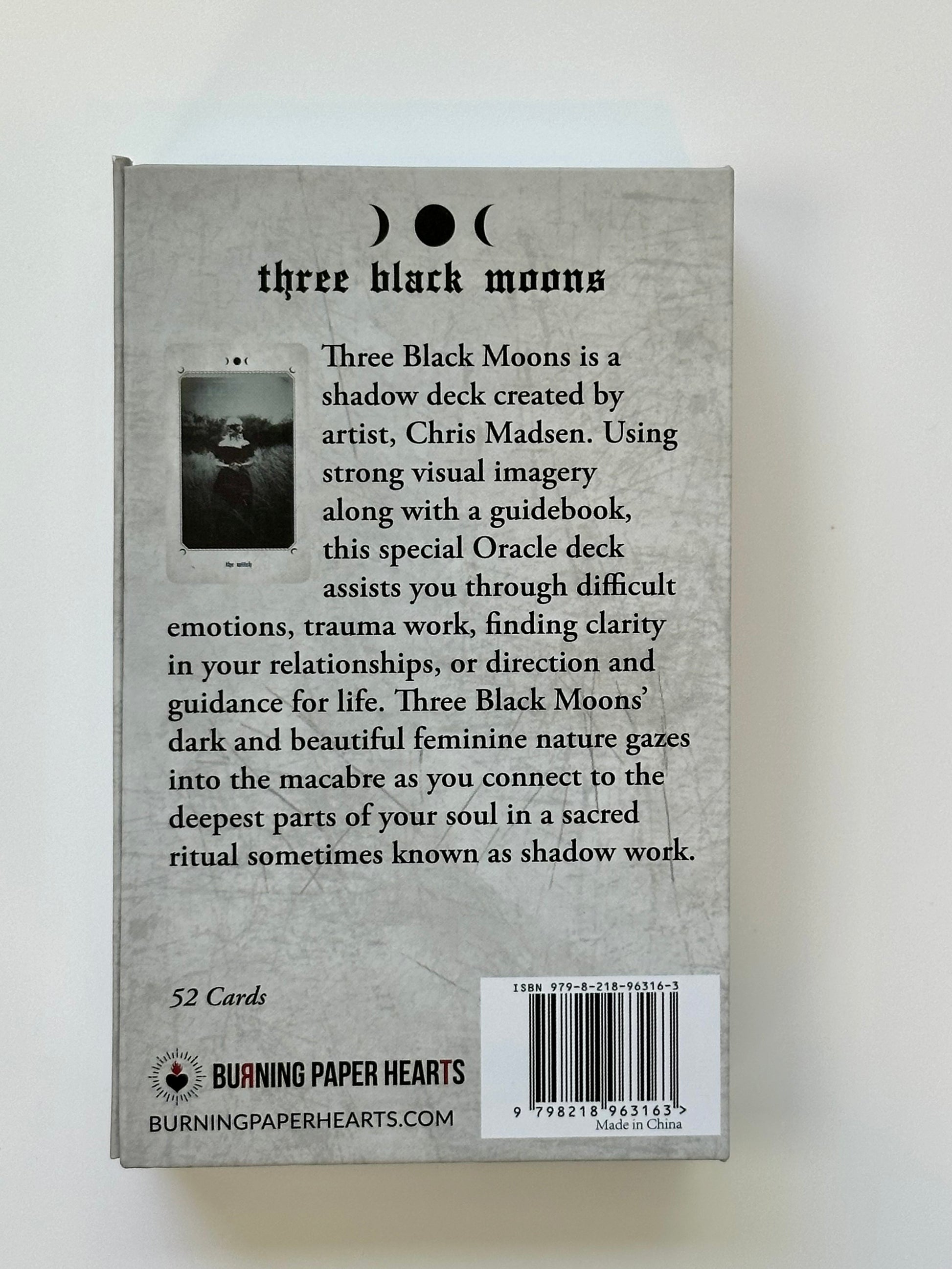 From the creator, "Using strong visual imagery along with a guidebook, this special Oracle desk assist you through difficult emptions, trauma work, finding clarity in your relationships, or direction and guidance for life. Three Black Moons' dark and beautiful feminine nature gazes into the macabre as you connect to the deepest parts of your soul in a sacred ritual sometimes known as shadow work."