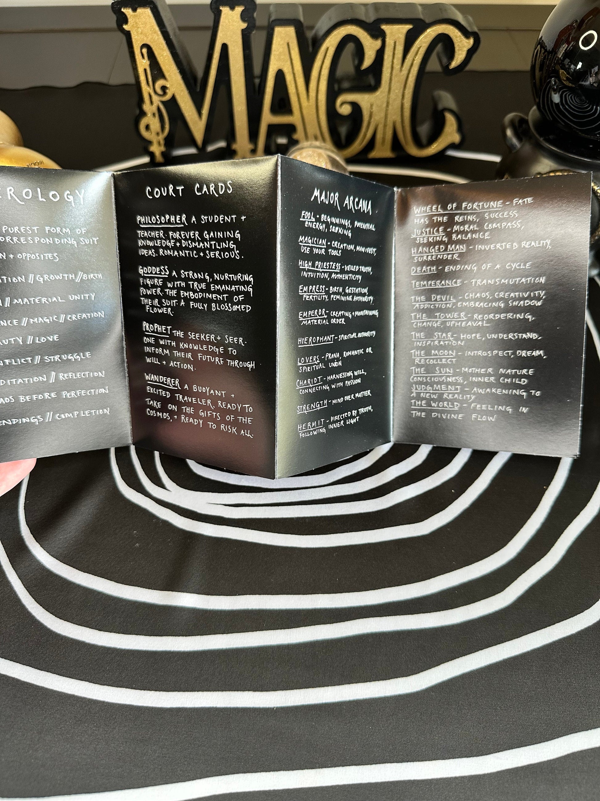 I am also offering the Guidebook, which is published and sold separately. This guidebook is black and white, features in-depth interpretations for each card, including reversals, suggestions for card spreads, and a brief history of tarot. The book is 133 pages with foil accents on the cover.