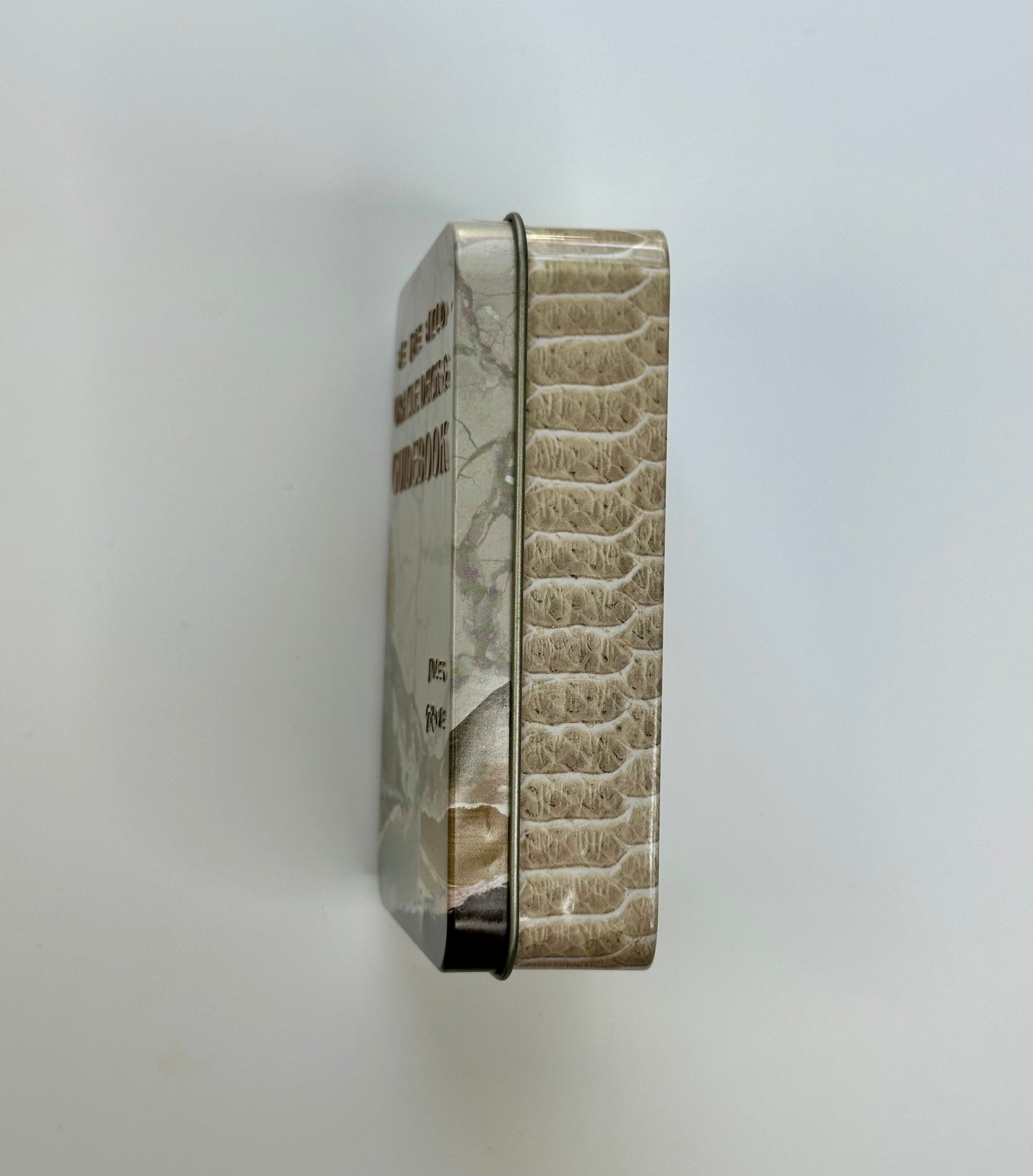 2-piece tin box for safe keeping and storage. Cards and guidebook both fit within tin, which measures 5" x 3.85"